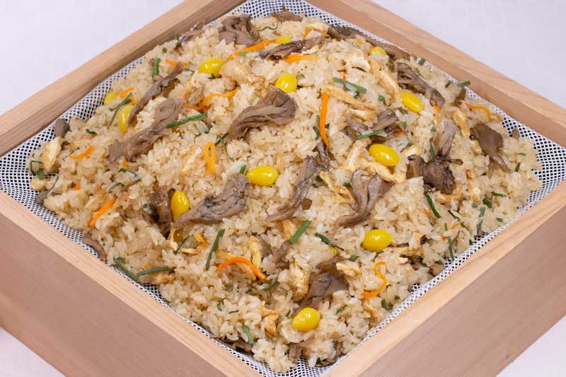 秋の味覚“松茸”をふんだんに炊き込んだおこわです。具材のきざみあげと銀杏は、松茸との相性もピッタリで松茸を引き立てます。